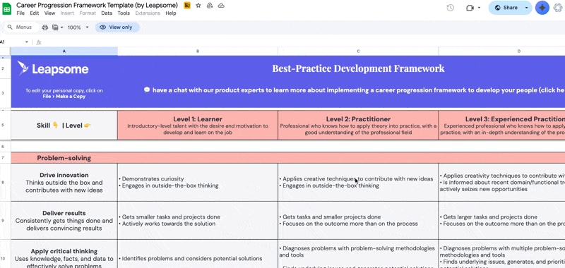 A competency framework template is a pre-built structure that defines the skills, behaviors, and knowledge required for success at different proficiency levels within an organization. Rather than creating a framework from scratch, a template gives you a starting point with common competency categories (like problem-solving, communication, and self-management) and level definitions (like learner, practitioner, and expert) already mapped out.