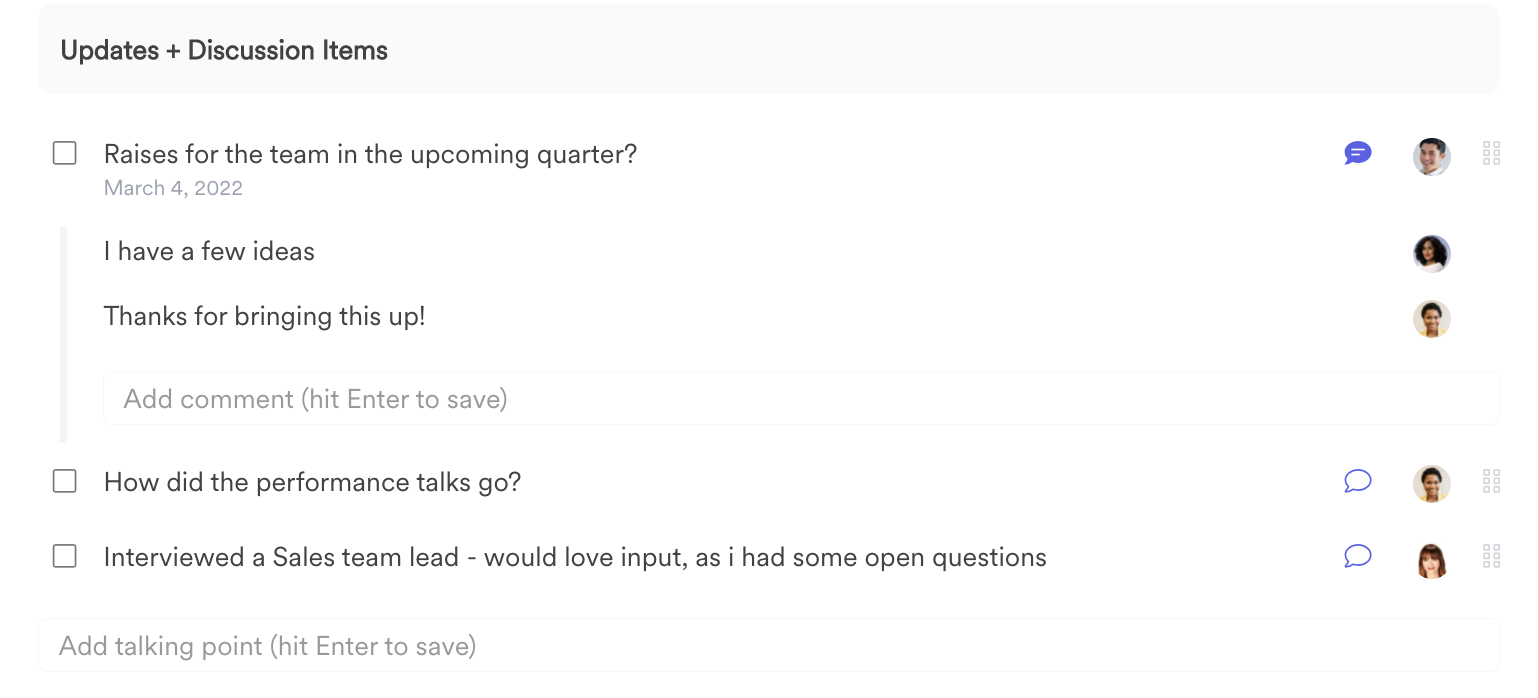 Any participant can add talking points to the meeting agenda in advance, with the option to make each talking point public or private. Team members can leave comments on any agenda item – whether their own or someone else’s – which sets the meeting on the right track by giving a preview of what people want to discuss. Advance commenting also highlights where team members want to build on each other’s talking points, and where they hold diverging opinions.