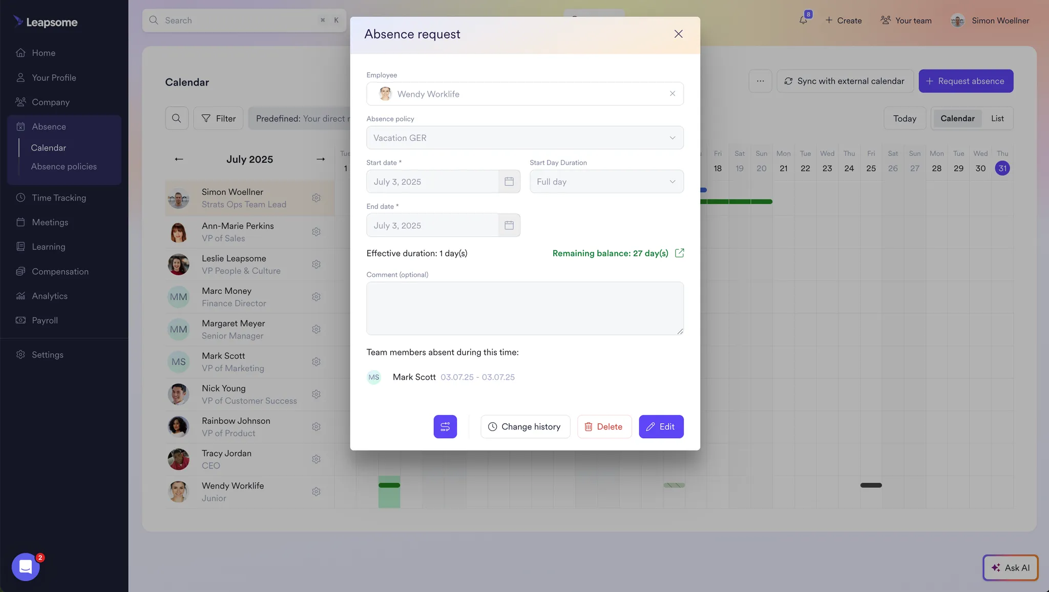 Absence edits now include full context: when the change was made, who made it, and what was adjusted. These time-stamped details give admins a clearer audit trail and reduce back-and-forth.
