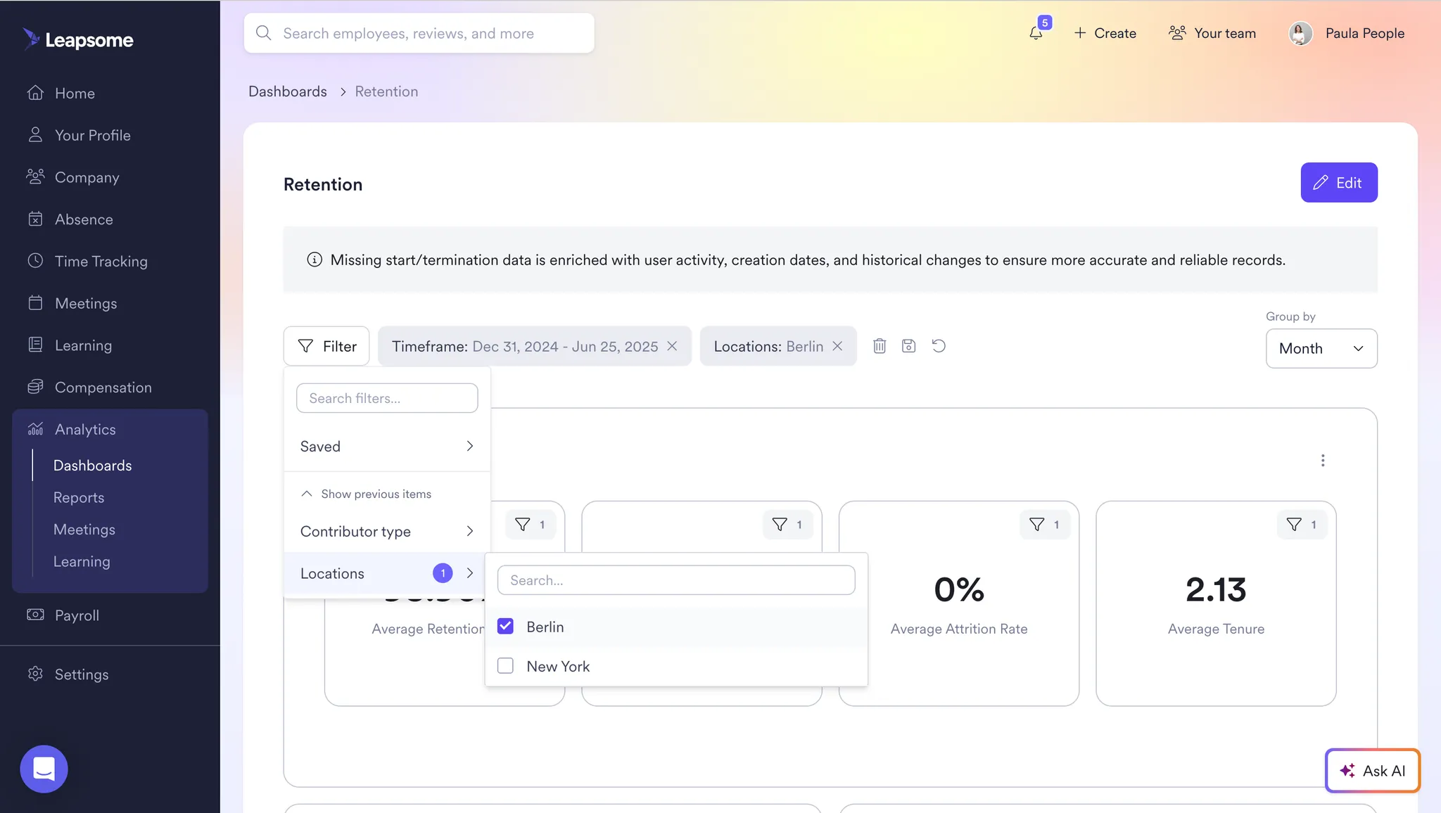 You can now filter dashboards by location to better understand how teams in different regions are doing. Whether you’re comparing Berlin vs. New York or remote vs. in-office, this gives you sharper, more localized insights.