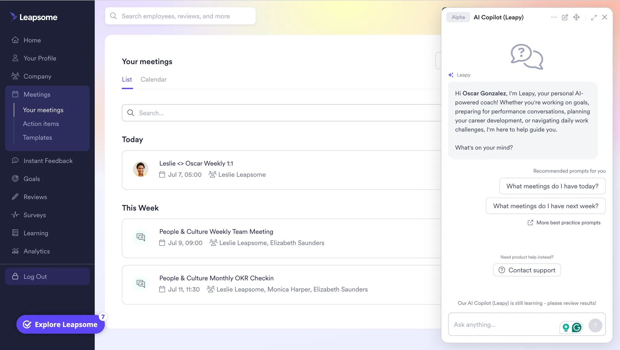 The AI Copilot now supports employees with relevant prompts for goals, tasks, and updates. Like having an AI coach in your corner minus the awkward pep talks.