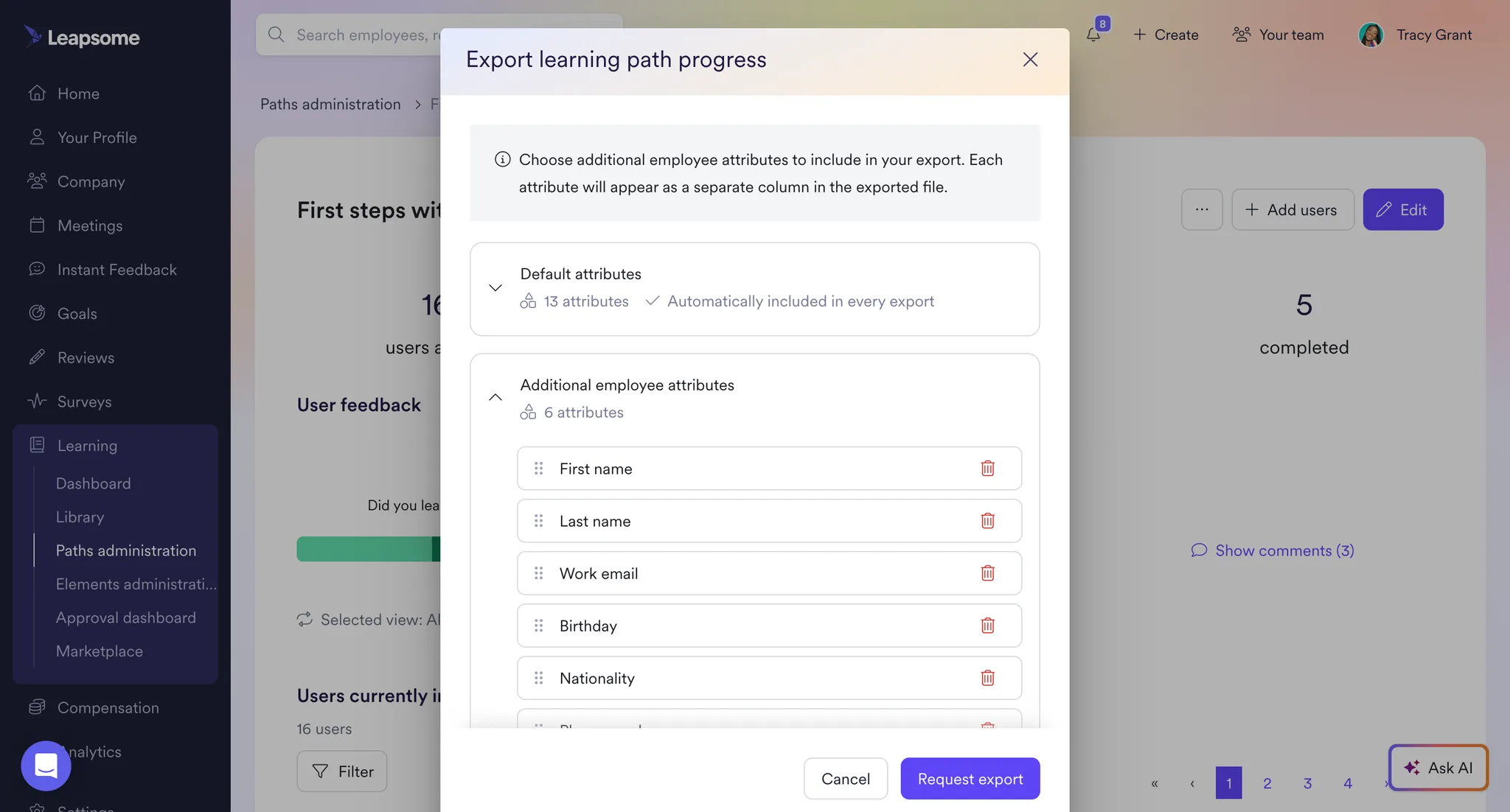 Learning exports can now include additional data such as location, department, or career level. This makes it easier to analyze completions by context and identify where support is most needed.