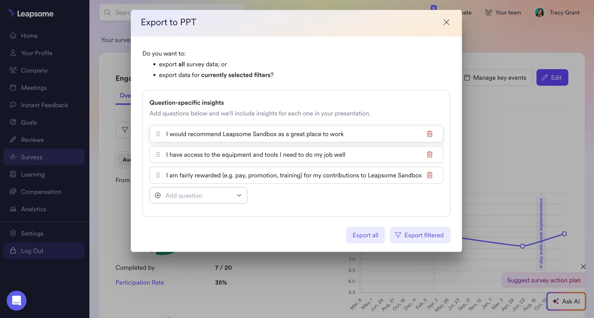 We’ve enhanced the PPT export experience to give you more control. You can now filter by specific questions, select which insights to include, and polish your presentation before downloading. This cuts down on manual edits post-export, so you can focus on the story, not the formatting.